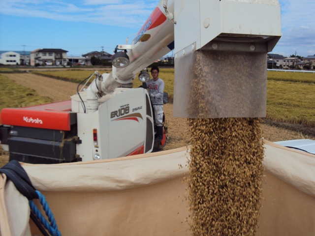 コンバインに乗って作業をしていると、通称「はしか」と呼ばれるイネの出すホコリがブワーっと舞い上がってきます。稲刈り終盤のこの時期になるとホント、ブワーっと。